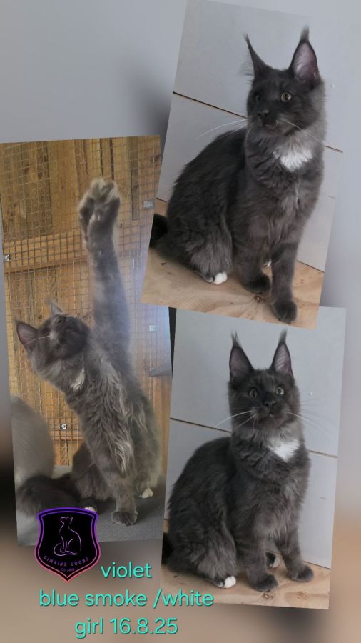 Violet is playful, confident, and full of fun, with that classic Maine Coon “look at me” energy. Her blue smoke and white coat makes her stand out, and she’s clearly a kitten who loves interaction and toys, always ready to leap into the next game.